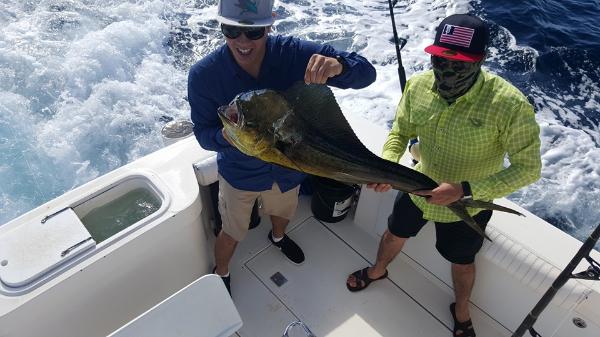 | Puerto Vallarta fishing report January 2016 Mahi and Marlin Mania offshore but dont take my word for it see our client fishing charter reviews below. review Marlin and Mahi I had the opportunity to go out on a 12 hour day of fishing with my wife, daughter and father on the"My Marlin," skippered by Steve Torres and crewed by Oscar This is the second year going out w Steve and he does not disappoint. Starting with Damon who does a great job in setting up the trip and communicating all neccessary details, I wanted to have the opportunity to catch a marlin as well as dorado. Steve and Oscar did an outstanding job letting us know what to expect and how the day would unfold. We trolled and had an early dorado hookup. Later Steve found floating debris and it was game on with the dorado. We caught five monster dorado (mostly bulls) I missed one. That gave us a total of 6 for the day. Other boats came to us after seeing our hookups. They weren't catching anything upon arriving; we had the right bait. The best was yet to come. After about 15 minutes of beginning to troll again, the marlin hit. With superior boat control by Steve, I was able to boat my first blue marlin after a 1/2 hour fight, weighing in at approximately 300 lbs. Right after it was over, Steve said, "Let's get another one." That's confidence. My family and I vacation in PV every Christmas and I would never consider another boat or captain. fishing charter review by Paul Sojkowski review Mahi mahi and Sailfish My father, brother in law and myself had a 10hr day aboard the Winner on December 28th 2015. We were able to catch 7 Mahi Mahi and 1 sailfish. Captain Caesar and crew worked very hard to get us our fish making this a day to remember! I highly recommend fishing with them if you are looking for a great fishing experience. fishing charter review by Patrick Patterson December is, according the several fishing calendars I checked, an excellent month for sport fishing in Puerto Vallarta, Mexico. As I was cruising with friends and wife to and from San Diego to Lima, with a stop in Puerto Vallarta in mid-December, one of my friends – an avid fisherman as am I – decided that we’d charter a boat to see if our acumen would be positively rewarded on the trip North at PV. Internet searching led me to PV Sportfishing, whose website offered a 31’ Bertram Sportfisherman, supposedly very well equipped. Their site and others also depicted the challenge facing one wishing to do billfish hunting: Banderas Bay, supposedly the second largest bay in the world, where it’s necessary to travel well over 20 miles from port to reach the hunting grounds of the marlin, sailfish or Dorado. This entails chartering for no less than 8 hours, as it’s a minimum of two hours out and two back at a good speed. The map of Banderas Bay published online by PV Sportfishing and others depicts the bay and the prime big game fishing spots: The Marietas Islands are 18 miles from the in-town marina; El Morrow is about 24 miles out, a bit north of the Marietas; La Cobretana is 36 miles out, and El Banco, (favored, with La Cobretana by many of the charter operators) is a whopping 50 miles from the PV dock. To make the decision more difficult, the charter rates are steep – at least for Mexico: 4 hours for $450 and 6 hours for $600 – but that limits one to fishing inside the bay and unlikely to raise any billfish or Dorado. Our choice was the 8 hour charter at $850, which would allow us to fish the Marietas and beyond. Arranging the charter was a snap: PV Sportfishing uses PayPal (one may use a credit card with PayPal’s secure system) to make a deposit, and I confirmed the date and time directly with the company by email, ordering drinks and box lunches at the same time. Efficient, pleasant, and all conducted in English before the cruise departed San Diego. We disembarked early, and the nearby pier was a $10.00 taxi ride away. So efficient was the process that we arrived at the “waiting area” of the Los Peines pier a half hour early. Our boat, the My Marlin (which incidentally “holds the record for the largest Marlin ever caught in a tournament in PV”), arrived with a pleasant and helpful English-speaking Captain – Steve Torres - and Mate – “Scubie.” After picking up our live bait (the boat had an excellent bait-holding tank, which kept the fish active for the entire day) and our box lunches, we motored out of the marina and were in moments well into the bay. The mate informed us that we had a 1 hour 45 minute ride to the billfish/Dorado area, so we settled back but were a bit surprised that the mate began the rod-rigging process after only an hour or so. The outriggers were deployed and 5 lines were streamed, two with lures and three with baitfish. At about 10:00 AM, one of the lines snapped out of the left outrigger, and I had a good-sized Dorado on. Almost immediately, another line sang out and we had a double-header going. Since I was in the right-hand fishing chair and my friend occupied the left, my line was immediately crossed with his. To simplify things, we switched rods, and worked our fish in. I boated mine first: about 25 pounds of jumping, flashing beautifully colored energy. My friend’s fish was a somewhat larger Bull, likely about 30-35 pounds, giving him a longer-lasting battle and the usual real tussle when it spied the boat. We were two-for-two, and the day was still young! Beware the feeling of euphoria: and, of course, that’s why the sport is called ‘fishing,’ not ‘catching – we continued to motor out well past the Marietas, to a distance of between 28 and 30 miles from PV – for over 4 hours before we had another strike. My rod bent, but I could immediately sense that this was a smaller Dorado. It never jumped, but rather sounded, and while fighting mightily for its life, was no match for the 80# test line and the Tiburon reel attached to the Calstar graphite rod. Unfortunately, that was the end of our ‘ca