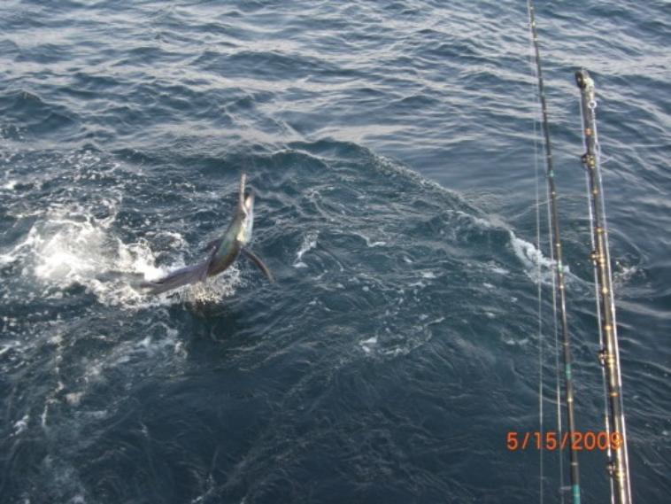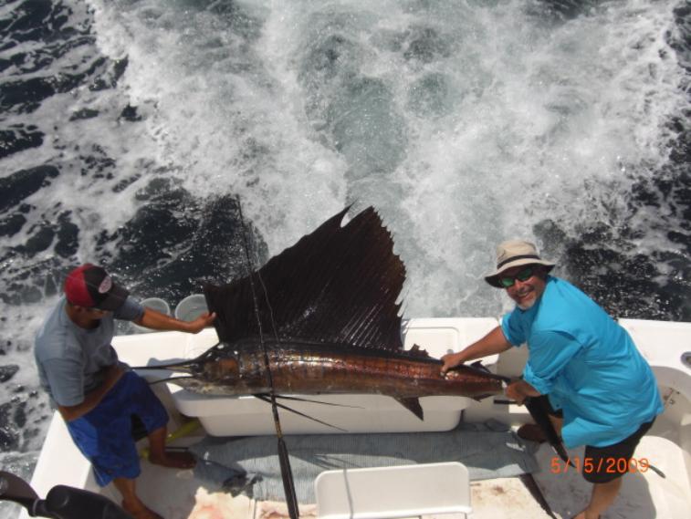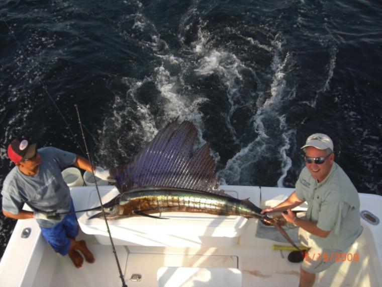 | Puerto Vallarta fishing report 05/15/09 Sailfish Frenzy! We took out Bobby, Charles, Mike, and Keith yesterday on the 2006 luhrs, the Sirena With Captain Steve and crew Freddy and Marcos. What a day right when We got around the point of Punta de mita We spotted a nice sailfish Marcos ran to the front of the boat casted out some live bait and boom We had a Sailfish on Keith was first and did a great job reeled in a nice 100 lb sailfish in about 15 minutes next we found a nice school of oDrado feeding off a small tree branch floating about 10 miles north of the point We caught 4 back to back enough to make some fresh ceviche for lunch then We decided to go and catch some more sailfish! We started heading further north by guayabitos but the conditions were so nice the water was like a lake You could see for miles about a 30 minutes later Captain Steve saw a couple sailfish sun bathing about a 2 miles away from us he speeded up the Sirena and 2 seconds later we were right on top of them but could not get a bite on 50 lb test so We tried with a 40 and boom the bigger sailfish hit and hit it hard within seconds You could see this beautiful fish fighting and jumping about 20 yards from the boat what a show! Mike nailed it though reeling in this 98 inch sailfish like a true pro it only took him 20 minutes to land it which is not so easy on 40 lb test. We kept trolling north following the birds and dolphins keeping a look out for sailfish as we were trolling a nice striped marlin hit a lure Captain Steve hit the throttle and hooked a nice striped marlin about 120 lbs. After that it was slow We did not see anything but dolphins for a couple hours then just like that We spotted about 5 sailfish jumping and swimming Marcos hooked another one this one was bigger then the first 2 though a nice female about 130 lbs after that we spotted a school of jacks picked up a nice triple hook up and then called it a day. but what a day 5 dorados,3 jack crevalle, 3 sailfish, and 1 striped marlin! You cant do much better then that. Check out all of our Puerto Vallarta fishing charters here or give us a call Our US line is 253-238-3988 e-mail info@puertovallartafish.com until next time tight lines! www.puertovallartafish.com |
