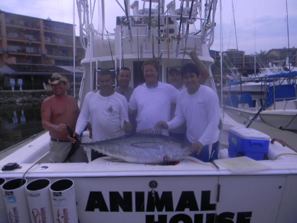 | Report by Roy Eise We chartered a 2005 Cabo Yacht on September 11th 2012 with Puerto Vallarta Sports Fishing (puertovallartafish.com) and our fishing trip with the "Animal House" was a huge success! We chartered for 12 hours, and all that they stated to us ahead of time, was all true. Everything was included as fishing license, bait, ice, cold water, clean and awesome yacht, and the best crew we ever could have asked for. We've fished before, but nothing like this. We caught a total of 7 very large (all over 100 lbs) Yellow Fin Tuna. This all happened within an hour and half (around 2pm) during our 12 hour charter. We totally recommend this crew and yacht for anyone who would be interested in deep sea sports fishing in the Pacific. I don't think i could say enough about them. We hit the jackpot that day, and the crew was just as excited and anxcious as we were when we seen the school of yellow fins jumping out of the water along with the dolphins. It was a site to see, and we got right down to business and didn't stop until there were no more. The crew was professional, and very knowledgeable about it all. Great equipment also on the yacht which i'm sure assisted in bringing in that many huge "fighting fish." We were looking for a fight, and we got it. Again, a HUGE success with such an awesome Crew!!! |