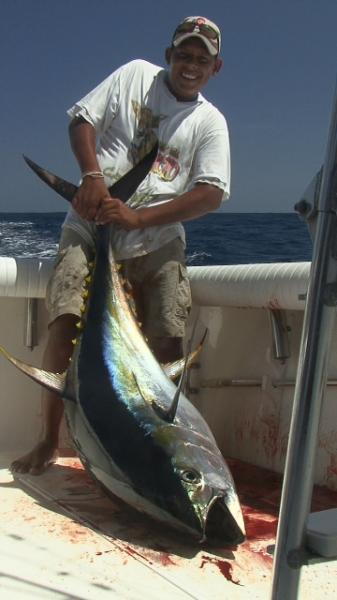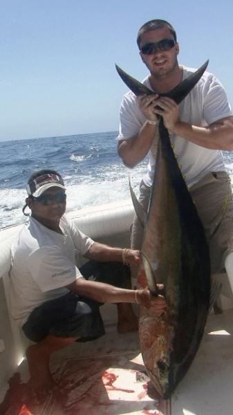 | Puerto Vallarta fishing Report April/02/2010 The Yellowfin tuna are still boiling in Puerto Vallarta but way offshore 20 miles past El Banco right off the islands We hit the fishing grounds about 9 am March 29th anticipating a late afternoon bite since there was big full moon the night before. There were 2 boats already at the fishing grounds birds were everywhere but no bite. We starting drifting with a big shool and about 11 am it was like Christmas yellowfin boiling and circling everywhere! We had our first hook up shortly after 11 am. Scott Allen's son was up and he reeled in the first Yellowfin of the day in about 20 minutes it was about 100 lbs. 15 minutes past and We had our 2nd hook up of the day this time Dad Scott Allen was on the reel pulling in another 100 pounder, after that we caught up with the herd and it was bite after bite totalling in 7 Yellowfin tuna's all about 100 lbs with one that was about 125 biting live Goggle eye Bait. |