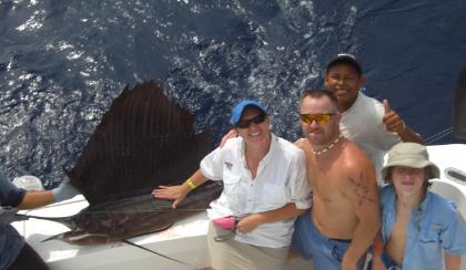 | Puerto Vallarta fishing report 05/15/09 Sailfish Frenzy! We took out Bobby, Charles, Mike, and Keith yesterday on the 2006 luhrs, the Sirena With Captain Steve and crew Freddy and Marcos. What a day right when We got around the point of Punta de mita We spotted a nice sailfish Marcos ran to the front of the boat casted out some live bait and boom We had a sailfish on Keith was first and did a great job reelled in a nice 100 lb sailfish in about 15 minutes next we found a nice school of dorado feeding off a small tree branch floating about 10 miles north of the point We caught 4 back to back enough to make some fresh ceviche for lunch then We decided to go and catch some more sailfish! We started heading further north by guayabitos but the conditions were so nice the water was like a lake You could see for miles about a 30 minutes later Captain Steve saw a couple sailfish sun bathing about a 2 miles away from us he speeded up the Sirena and 2 seconds later we were right on top of them but could not get a bite on 50 lb test so We tried with a 40 and boom the bigger sailfish hit and hit it hard within seconds You could see this beautiful fish fighting and jumping about 20 yards from the boat what a show! Mike nailed it though reeling in this 98 inch sailfish like a true pro it only took him 20 minutes to land it which is not so easy on 40 lb test. We kept trolling north following the birds and dolphins keeping a look out for sailfish as we were trolling a nice striped marlin hit a lure Captain Steve hit the throttle and hooked a nice striped marlin about 120 lbs. After that it was slow We did not see anything but dolphins for a couple hours then just like that We spotted about 5 sailfish jumping and swimming Marcos hooked another one this one was bigger then the first 2 though a nice female about 130 lbs after that we spotted a school of jacks picked up a nice triple hook up and then called it a day. but what a day 5 dorados,3 jack crevalle, 3 sailfish, and 1 striped marlin! You cant do much better then that. For more info on the Sirena boat and Captain Please click here or give us a call Our US line is 785-640-7753 e-mail info@puertovallartafish.com until next time tight lines! www.puertovallartafish.com |
