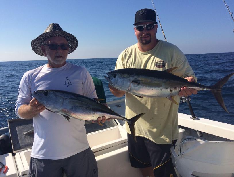 | Inshore Yellowfin Tuna Tuna fishing charters it does not happen all the time but if you are here when small Yellowfin Tuna are btiing inshore consider yourself very lucky it only will happen a few weeks of the year normally. between June and October. |