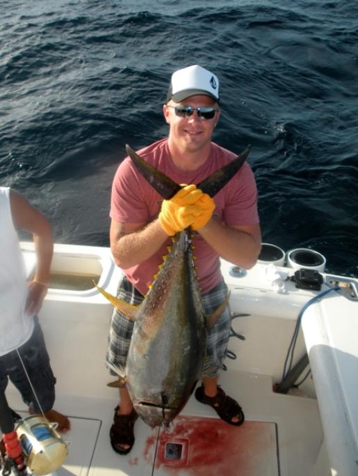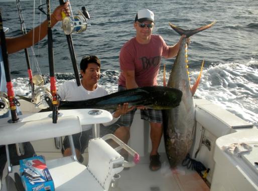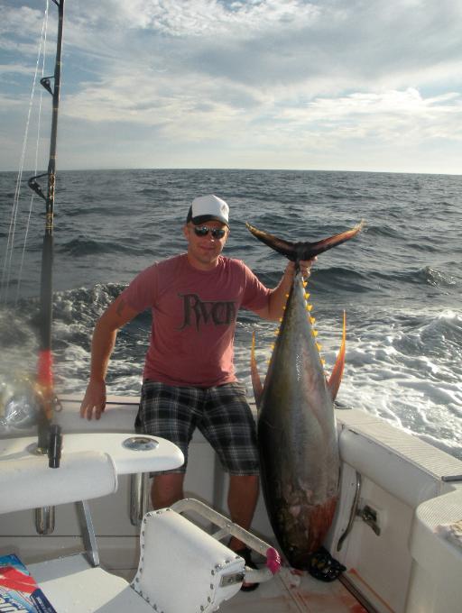 | Puerto Vallarta fishing report Jan-10-2011 I cannot say enough about all the People involved with Puerto Vallarta fish. I just got back from a 14 hour day aboard the Animal House and had a blast!!! I was supposed to Be aboard the Sirena but she had some motor issues, so Damon upgraded me to the Cabo Well as we all know Salt water is hard on boats and the morning of my fishing day the Cabo also had some issues so Once again Damon was on it and Called up the Captain and Crew of the beautiful Cabo yacht Animal House. I think they were actually asleep when he called them but they were there in no time!! After leaving the docks it seemed like no time we were already 55 miles offshore and fishing. The Animal house hauls! It started off a little slow but around 12pm we had our first hook up. Flying the penn kite the captain hooked onto a beautiful Yellowfin tuna and the fight was on!! What incredible power those fish have! 40 minutes later we landed it. Around 190 pounds. Shortly there after the birds were diving and we were on fish again. The captain and crew worked very hard switching all of the gear over from trolling rigs to the kites again. A huge Mahi Mahi started immediately jumping at the bait!! Once we hooked onto it about 10 minutes later we landed it. What an amazing fish.. Seemed like 30 minutes later we hooked up another yellowfin tuna and the fight was on again (this time with no harness standing on the bow of the boat!) This one was around 110 pounds but still an awesome fight! We finished the day off with another nice Mahi Mahi and lost a real big tuna in the fight! The animal house is an Awesome boat and the captain is the hardest working i have ever seen!! I will be back many times to come with the Animal House!!! Cant say thanks again to Damon and the crew. Definitely work every penny! Don't waste your time booking at the marina with some random boat! check out more info on the Animal house boat here Zach Morrow Highlands Ranch, CO 1/11/10 |
