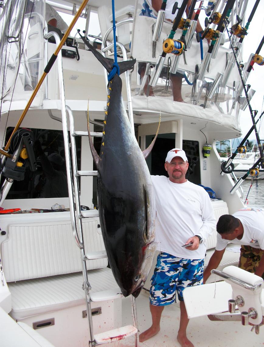 | Angler report Larry Haynes. September For years I've had the dream of catching a 200+lb Cow, but never dreamed that I would catch a 200+ lber and a 300+ lber in the same trip! My wife, son Eric, and I fished with Capt Torres 17 & 18 Sept....AWESOME TEAM (like I need to tell anyone). Original plans were to fish 18 and 21 Sept, and try and squeeze a trip in with Capt Manny (didn't happen, but there's a next time!), but with all the computer models saying that that Tropical Storm Karl was going to pass over the PV area on that day, I decided to ask them to switch dates from the 21st to the 17th...just to be certain to get the fishing in. Day 1 Met Capt and crew at the lighthouse at 0600, did the meet and greet thing, got food, fuel, bait and on our way. Hit the rock, made bait rather quickly and lines in the water just as fast as the bait was coming in. About 0920, and raining like heck, the first bite was on. Our son Eric was in the driver's seat and it was "game on" for the next hour on a 200+ pound Blue. After that, things went cold for a couple hours when the next bite was on. The battle didn't last long, because the hook either pulled, or the fish spit it out. I just know that it had some real shoulders on it. A bit later we bagged a 75 lb yellow fin and things went quite again....Capt Steve said, the bit will turn back on about 1 p.m., so we just cooled our heels and trolled around to see what we could pick up. Like clock work, at 1:04 the next bite was on.....then off.....a bit later....another.....and then off.....then another......Dang it. We then plowed the water for a few hours when the next bit was on. While fighting this fish, a school of big tuna were jumping all around the boat - it was crazy cool seeing 50-100lbers jumping all around me, while fighting the first dream fish. 1 hour later, a 200+ lb cow lay on the deck and I was about 10lbs lighter from sweating. Day 2 Same as day 1....greatings, bait, fuel and back to the rock. Wife was up first this day....0900-ish she lock's up with a nice bull doroado. After a decent fight, she bagged the bull and was ready for more. After a lul in the action....Our son reeled in a really nice Wahoo. A little while later, Capt Steve tells Freddy, who just caught a big skippy, to put it on the down-rigger at about 100 ft. Approximately 30 minutes after setting the bait at 100 ft, the big one hit - I've never seen a fish take so much line, so fast. The reel was at the Spectra in a flash. The fight was on....and on.....and on....1 1/2 hours later, the 300 lber was brought on the boat and I was exhausted. Day one....200+ lb Blue, 75lb yellow fin, and a 200+ lb Cow Day two....Bull Dorado, a nice wahoo, and a 300+ lb Cow Enjoy the pics! Larry H |